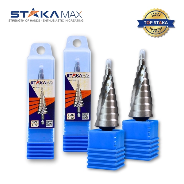 Mũi khoan tháp 4-22 lẻ xoắn STAKA là dụng cụ chuyên dùng để khoan các lỗ có kích thước khác nhau trên nhiều loại vật liệu như thép, gang, nhôm, gỗ, nhựa, v.v.Mũi khoan được làm từ thép hợp kim cao cấp, có độ cứng cao và độ bền bỉ tốt.